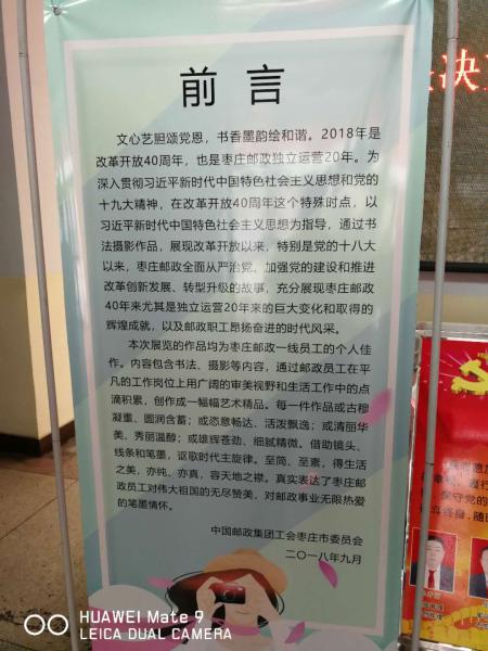為深入貫徹習(xí)近平新時(shí)代中國(guó)特色社會(huì)主義思想和黨的十九大精神,在改革開(kāi)放40周年這個(gè)特殊時(shí)點(diǎn),棗莊市分公司舉辦慶?!案母镩_(kāi)放40周年”暨棗莊郵政獨(dú)立運(yùn)營(yíng)20周年書(shū)法攝影作品展覽活動(dòng)。