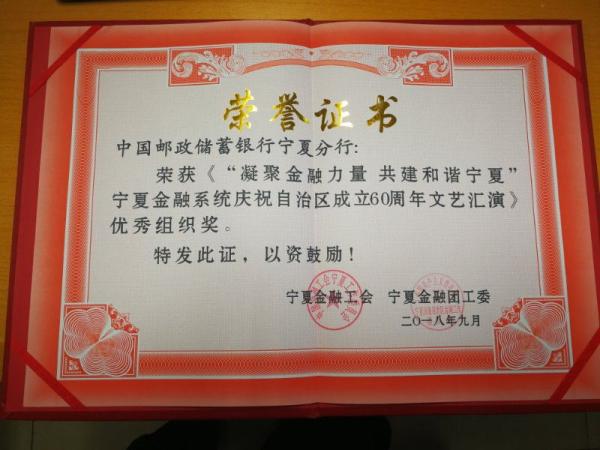 為慶祝自治區(qū)成立60周年暨建國69周年,推動寧夏金融系統(tǒng)職工群眾性文化活動的廣泛開展,豐富廣大職工業(yè)余文化生活,展示新時代寧夏金融職工的精神風(fēng)貌。9月7日,寧夏金融工會、寧夏金融團(tuán)工委舉辦了“凝聚金融力量 共建和諧寧夏”—寧夏金融系統(tǒng)慶祝自治區(qū)成立60周年暨迎國慶文藝匯演。此次文藝匯演共有31家單位38個節(jié)目參與,其中由寧夏區(qū)分行主辦,銀川市分行承辦的參演節(jié)目《不忘初心》,因主題突出,藝術(shù)感染力強(qiáng),體現(xiàn)寧夏郵儲銀行員工忠誠擔(dān)當(dāng)、愛崗敬業(yè)、團(tuán)結(jié)奮進(jìn)、不忘初心的精神風(fēng)貌。在最終的綜合評審中脫穎而出,獲得三等獎和優(yōu)秀組織獎的好成績。