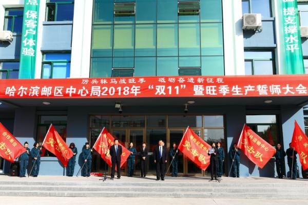 10月25日,中國(guó)郵政集團(tuán)公司哈爾濱郵區(qū)中心局召開(kāi)迎戰(zhàn)2018年“雙11”暨旺季生產(chǎn)誓師大會(huì),全面動(dòng)員部署“雙11”及旺季生產(chǎn)各項(xiàng)工作。會(huì)上,來(lái)自該郵區(qū)中心局各條戰(zhàn)線的六個(gè)代表隊(duì)分別做了表態(tài)發(fā)言,黑龍江省寄遞事業(yè)部副總經(jīng)理、哈爾濱郵區(qū)中心局總經(jīng)理金龍為各個(gè)代表隊(duì)授“突擊隊(duì)”旗幟。
