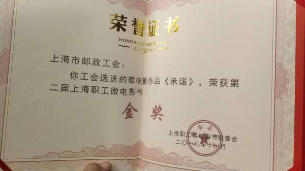 2018年11月30日,由上海市總工會(huì)主辦的“最美勞動(dòng)者”第二屆上海市職工微電影節(jié)頒獎(jiǎng)典禮在上海國(guó)際時(shí)尚中心舉行。上海郵政受邀參加紅毯儀式并出席頒獎(jiǎng)禮。本次微電影節(jié)入圍影片數(shù)量創(chuàng)歷史新高,競(jìng)爭(zhēng)激烈,佳片連連,所有獎(jiǎng)項(xiàng)均在現(xiàn)場(chǎng)宣布結(jié)果。最終,上海郵政工會(huì)選送的《承諾》不負(fù)眾望,繼首屆微電影節(jié)后,再次奪得金獎(jiǎng)!另獲最佳剪輯獎(jiǎng)!為上海郵政獲得榮譽(yù)!