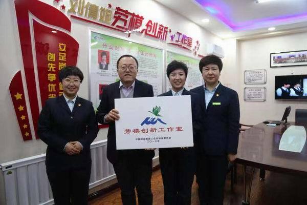 吉林省分公司副總經理、工會主席岳福忠向劉倩妮(右二)勞模創(chuàng)新工作室頒發(fā)牌匾