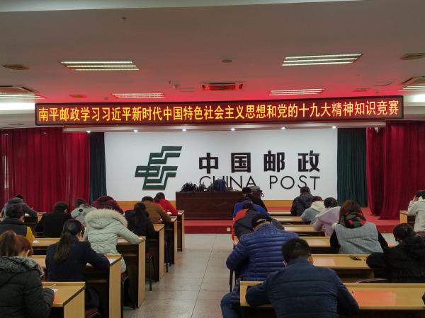 為進一步深刻學(xué)習(xí)領(lǐng)會習(xí)近平新時代中國特色社會主義思想和黨的十九大精神,12月20日上午在15樓會議廳,南平郵政分公司工會舉辦學(xué)習(xí)習(xí)近平新時代中國特色社會主義思想和黨的十九大精神理論知識競賽活動。抽調(diào)來自各縣(市、區(qū))分公司、市機關(guān)各部室管理、班組職工共45人參加了理論考試。
