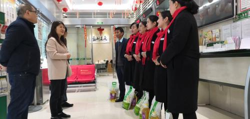 在南塘街支局,史主席對職工們良好的精神面貌給予了充分肯定,實地了解了支局旺季業(yè)務(wù)發(fā)展宣傳工作的落實,向網(wǎng)點負責(zé)人詳細詢問了余額、保險發(fā)展的具體情況。與網(wǎng)點主任座談,了解職工個人收入、業(yè)務(wù)發(fā)展獎勵對職工的激勵調(diào)動效果,并鼓勵南塘支局保持發(fā)展態(tài)勢,不斷超越自我,新增余額早日完成!史主席在網(wǎng)點為職工送上慰問品,祝愿職工們節(jié)日快樂、闔家幸福!