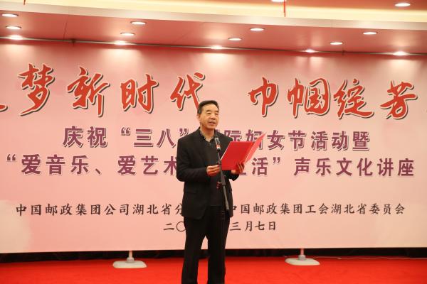 荊楚三月,春光明媚。3月7日下午,湖北省分公司舉行慶?!叭恕眹?guó)際婦女節(jié)活動(dòng)暨“愛音樂 愛藝術(shù) 愛生活”聲樂文化講座,表彰2018年度全省郵政企業(yè)女職工先進(jìn)集體和優(yōu)秀女職工,發(fā)起“讓閱讀成為一種生活方式”倡議,希望全省郵政女職工爭(zhēng)做知性修身的踐行者、企業(yè)發(fā)展的推動(dòng)者和中華美德的傳承者。