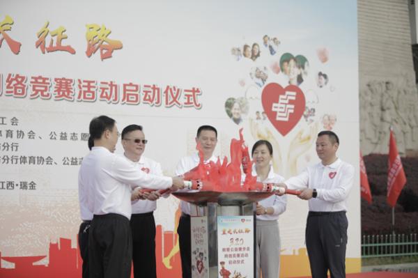 隨后,郵儲銀行工會主席劉敏宣布郵愛公益健步走網(wǎng)絡(luò)競賽活動正式啟動,并依次將“郵儲銀行公益志愿者協(xié)會”會旗傳遞給江西省分行行長、黨委書記肖天星及公益志愿者代表。而后,由郵儲銀行工會主席劉敏,總行高級資深經(jīng)理、江西省分行黨委書記、行長肖天星,瑞金市委書記、瑞金經(jīng)濟開發(fā)區(qū)黨工委書記許銳,總行工會副主席鄭海英,江西省分行黨委委員、副行長、工會主席劉承亞,瑞金市委副書記、市政府副市長李立東6位領(lǐng)導(dǎo)和嘉賓共同點燃出征火炬,并分別傳遞給6個志愿者方隊(共360人)隊長。隨著三名號手吹響出征軍號,這支“郵愛紅軍”全面開啟從當(dāng)?shù)貧v史博物館出發(fā)至紅井景區(qū)約3公里的健步走,將“郵愛”腳印深深記印在革命圣地,傳遞到每一個角落,向社會不斷傳遞愛心和正能量。