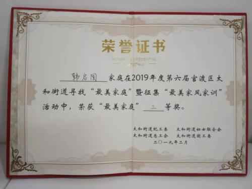 經大賽評審團考評,韓啟國家庭在第六屆官渡區(qū)太和街道“最美家庭”暨征集“最美家風家訓”活動中,榮獲“最美家庭”三等獎。(云南郵政工會)