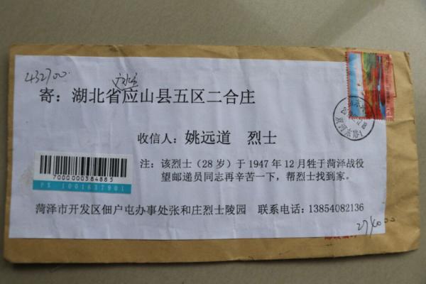 2月22日,一封來自山東菏澤市張和莊烈士陵園、收信人為姚遠道烈士的掛號信,幾經(jīng)輾轉(zhuǎn)來到廣水投遞站市投五段投遞員沈?qū)殫澋氖稚?,“該烈士?8歲)于1947年12月犧牲于菏澤戰(zhàn)役,望郵遞員同志再辛苦一下,幫烈士找到家?!毙欧馍系倪@樣一句話讓沈?qū)殫澅陡袎毫Αr隔72年,收信地址“湖北省應(yīng)山縣五區(qū)二合莊”隨著行政區(qū)劃的調(diào)整早已更名,收信人個人信息亦無法在戶籍系統(tǒng)中查詢,留給沈?qū)殫澋木€索太少了。“姚遠道是位烈士,是為了解放新中國而犧牲的,無論如何我們郵政要幫他找到家!”抱著這樣的念頭,這位全省勞模再一次踏上了這條既熟悉又陌生的“死信復(fù)活路”。