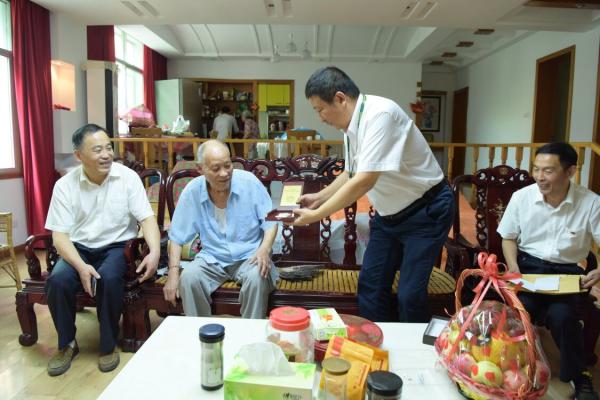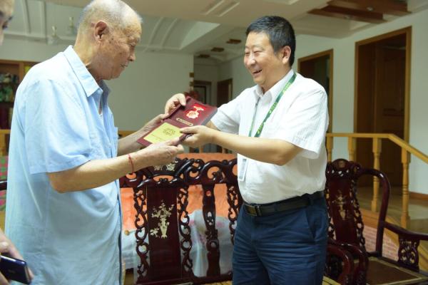 胡智宏為老人送上中共中央、國務(wù)院、中央軍委頒發(fā)的“慶祝中華人民共和國成立70周年”紀(jì)念章,并親手為其佩戴,并合影留念。最后,再三叮囑老人保重身體,并叮囑家人一定要照顧好老人的生活起居,祝愿老人健康長壽。