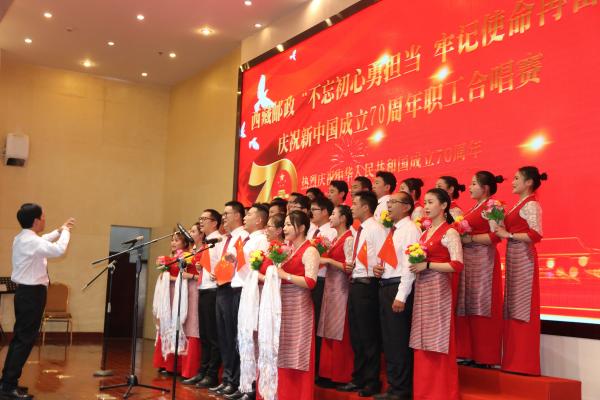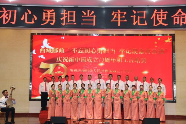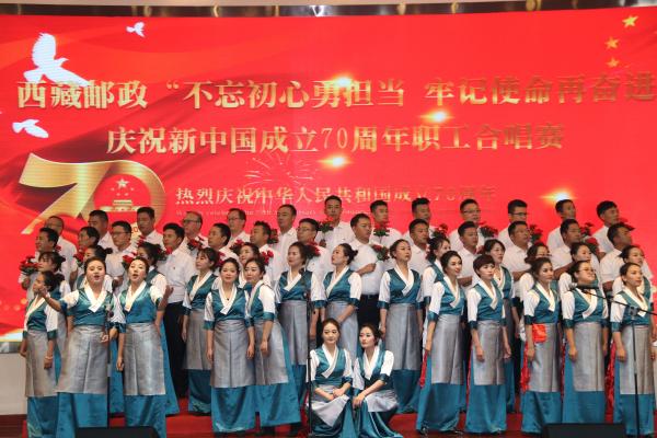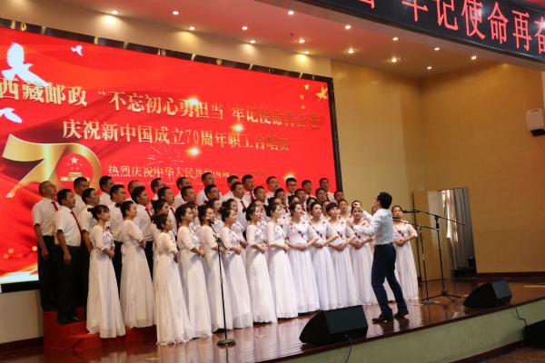 為隆重慶祝中華人民共和國成立70周年,深化西藏郵政系統“不忘初心 牢記使命”主題教育,豐富職工群眾文化生活,唱響愛國主義主旋律,進一步增強西藏郵政廣大干部職工初心使命意識,銘記革命歷史,弘揚民族精神,展現積極向上朝氣蓬勃的精神風貌。9月26日下午,西藏郵政開展“不忘初心勇擔當、牢記使命再奮進”慶祝中華人民共和國成立70周年職工合唱比賽,來自拉薩郵政單位的4支代表隊的150名干部職工參加了本次比賽。