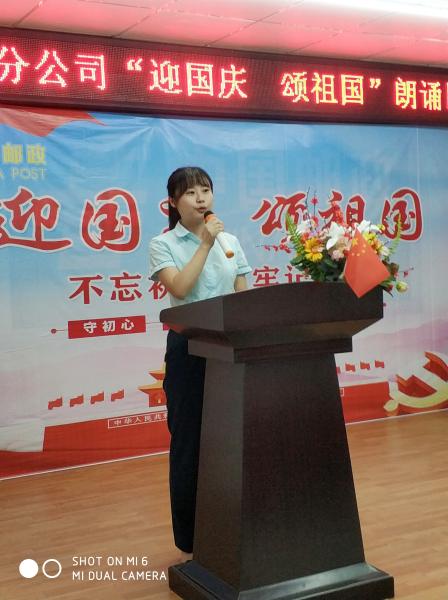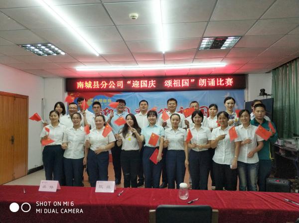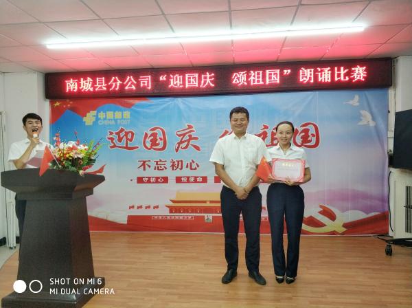 為隆重慶祝中華人民共和國(guó)成立70周年,大力弘揚(yáng)以愛國(guó)主義為核心的偉大民族精神,在全縣郵政廣泛開展形式多樣、豐富多彩的群眾性主題宣傳教育活動(dòng),9月28日,我南城縣郵政工會(huì)舉辦了全縣郵政“迎國(guó)慶 頌祖國(guó)”朗誦比賽。