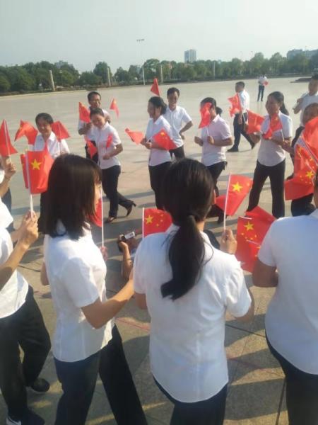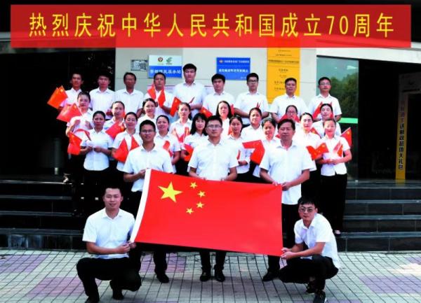 當(dāng)天下午,活動首先在縣分公司大樓門口進行,大家排成兩排,手搖國旗,齊聲共唱《我和我的祖國》。
