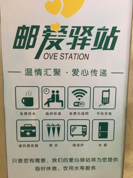 今年5月下旬,根據(jù)江西省分公司和省郵政工會(huì)《關(guān)于做好江西郵政營(yíng)業(yè)網(wǎng)點(diǎn)“愛心驛站”建設(shè)的通知》文件要求,上饒市分公司和市郵政工會(huì)在帶湖路城市網(wǎng)點(diǎn)建設(shè)了一個(gè)標(biāo)準(zhǔn)化的“郵愛驛站”示范點(diǎn)。