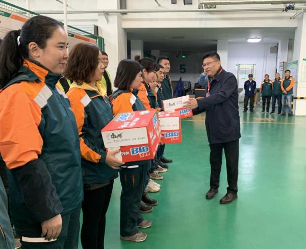 隨后,谷德凱常務(wù)副主席一行前往基層慰問一線職工。每到一處,谷主席都為一線員工送去方便面、火腿腸、水果等慰問品,并與職工親切交談,詳細(xì)了解業(yè)務(wù)發(fā)展情況,詢問“雙11”期間投遞量的變化、一線職工收入情況等,實地查看了生產(chǎn)作業(yè)場地、職工書屋、職工活動室、職工食堂、職工小家、創(chuàng)新工作室等。在太原國際郵件互換局和太原郵區(qū)中心局,谷主席對大家積極應(yīng)對“雙11”,全力以赴保時限、保質(zhì)量、保服務(wù)給予充分肯定。他指出,“雙11”是創(chuàng)收旺季,一定要注意郵件安全,確保質(zhì)量和時限,踐行好“人民郵政為人民”的服務(wù)宗旨,努力打造行業(yè)“國家隊”。在看到現(xiàn)場忙碌的工作場景后,他叮囑大家在工作的同時要保護好身體,注意勞逸結(jié)合。在朱迎春創(chuàng)新工作室,谷主席認(rèn)真聽取了創(chuàng)新工作室情況,詳細(xì)了解了推出的創(chuàng)新成果,表示肯定和贊許。特別是對“郵政半掛車廂制動系統(tǒng)加裝低氣壓報警裝置”給予高度評價,并現(xiàn)場對如何改進(jìn)集包封裝,提高生產(chǎn)效率、減少職工重復(fù)勞動提出建議。他要求創(chuàng)新工作室要起到示范引領(lǐng)和輻射帶動作用,從工作實際出發(fā)優(yōu)化工藝流程,特別是在小機具方面有一些革新,不斷提高生產(chǎn)效率,充分發(fā)揮創(chuàng)新工作室破解工作難題、推動企業(yè)創(chuàng)新發(fā)展的作用。