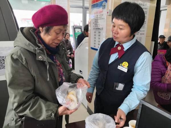 當(dāng)日中午時(shí)分,正值鐵區(qū)營業(yè)所為客戶代發(fā)工資的高峰期。與往常一樣,前來辦理業(yè)務(wù)的人群很快就擠滿了廳堂。臨近12點(diǎn)鐘,來不及吃午餐的柜員們都在緊張有序地為客戶辦理著業(yè)務(wù)。忽然,一位60多歲的老大娘拎著一個(gè)深色的布兜走進(jìn)鐵區(qū)營業(yè)所廳堂內(nèi),找到鐵區(qū)營業(yè)所經(jīng)理關(guān)琳說道:“每次來辦理業(yè)務(wù)你們都給我們倒一杯水,還提供糖果。我們老年人就怕到銀行辦理業(yè)務(wù),但你們每一次服務(wù)都很有耐心,都很熱情周到,真的是太感謝你們了,這些天看你們辦理業(yè)務(wù),為我們服務(wù)真是太辛苦了,我今天特意烙了糯米餅給你們送過來”阿姨邊說邊從黑色的布兜拿出熱騰騰的糯米餅。接過糯米餅,鐵區(qū)營業(yè)所經(jīng)理關(guān)琳連聲感謝,“這是我們應(yīng)該做的,我們也特別感謝您,謝謝您對(duì)我們的理解和支持,我們將繼續(xù)做好服務(wù)”。粘粘的糯米餅給寒冷的冬日增添了一份愛的暖意。
