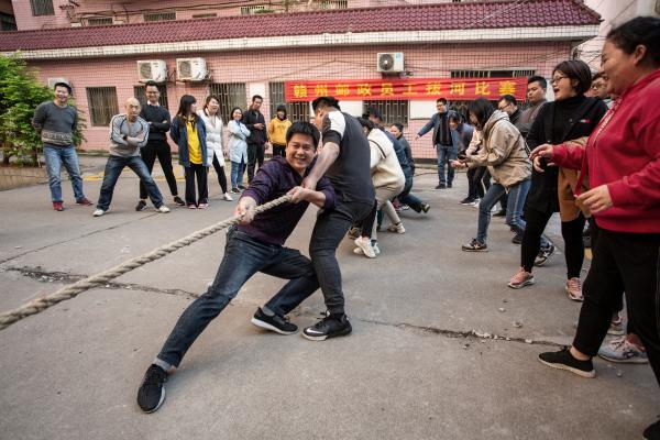 比賽現(xiàn)場(chǎng),參賽隊(duì)員們緊握繩索,身子稍往后傾,拉開(kāi)“弓字步”,凝神聚氣,一觸即發(fā)。只聽(tīng)裁判一聲哨響,比賽雙方的隊(duì)員們立刻卯足勁兒往后拔,大家漲紅著臉,咬緊牙關(guān),使出了全身的力氣往后來(lái)拽繩子。“一二加油!一二加油!……”啦啦隊(duì)吶喊著,為場(chǎng)上隊(duì)員們加油鼓勁,氣勢(shì)絲毫不遜于參賽隊(duì)員。現(xiàn)場(chǎng)吶喊聲、加油聲、歡笑聲此起彼伏,像是在奏響一支氣勢(shì)磅礴的交響曲,激勵(lì)著每一位拔河隊(duì)員迸發(fā)出“怒放的生命”激情。經(jīng)過(guò)激烈的角逐,最終章貢區(qū)分公司隊(duì)以全勝戰(zhàn)績(jī)成功衛(wèi)冕了冠軍。