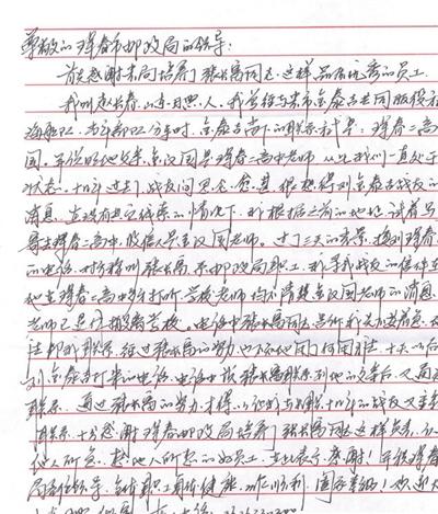 “張長(zhǎng)富同志負(fù)責(zé)、認(rèn)真,急他人所急,想他人所想,幫助我聯(lián)系上失聯(lián)十幾年的戰(zhàn)友,感謝琿春郵政培養(yǎng)了張長(zhǎng)富同志這樣品質(zhì)優(yōu)秀的員工。祝琿春郵政各位領(lǐng)導(dǎo)、全體職工身體健康、工作順利、闔家幸福。”11月18日一大早,一封來(lái)自山東省日照市的掛號(hào)信被送到了吉林省琿春市郵政分公司總經(jīng)理的手中?! ?/p>