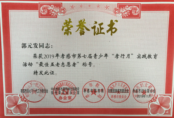 劉歡是孝南區(qū)北正街郵政支局的營(yíng)業(yè)員,在工作中他熱情真誠(chéng)地為客戶做好延伸服務(wù),在家中他快樂(lè)陪伴孝敬父母,被評(píng)為孝感市“最美孝德青少年”。郭元發(fā)是市分公司退休干部,退休后,他退休不褪色,傾力于關(guān)愛下一代事業(yè),組織開展了郵政職工子女書法培訓(xùn)班、愛心包裹捐贈(zèng)等一系列、形式多樣的孝行實(shí)踐活動(dòng),被評(píng)為孝感市“最佳五老志愿者”。