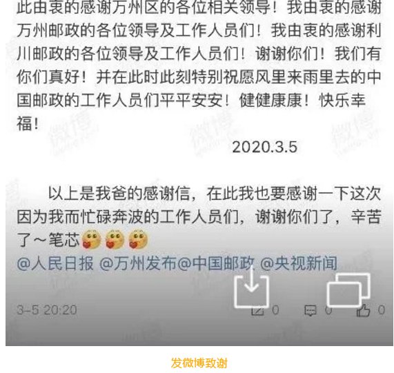 女兒小麗還特意將這封感謝信發(fā)了微博,并@了人民日?qǐng)?bào)、央視新聞、中國(guó)郵政及萬(wàn)州發(fā)布,向幫助她的人比心。