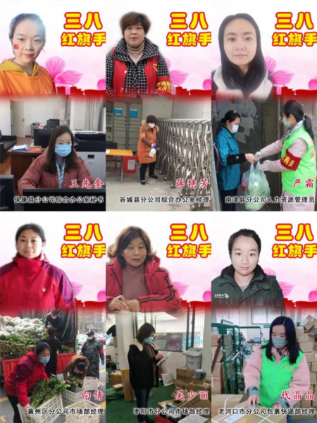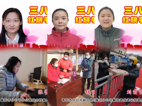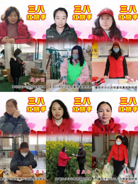 2020年3月8日,第110個(gè)“三八”國(guó)際勞動(dòng)?jì)D女節(jié)到來(lái)之際,襄陽(yáng)市郵政分公司決定授予宜城分公司鄂西支局經(jīng)理曾慶玲、老河口分公司包裹快遞部經(jīng)理代晶晶、谷城分公司綜合辦公室經(jīng)理 蔣艷芳、??捣止揪C合辦公室辦事員王先奎、棗陽(yáng)分公司市場(chǎng)部經(jīng)理吳少麗、棗陽(yáng)分公司副總經(jīng)理錢(qián)麗、南漳分公司綜合辦公室辦事員嚴(yán)霜、襄州分公司市場(chǎng)部經(jīng)理向倩、樊城分公司襄城投遞站投遞員 陳秀琴、樊城分公司解放路投遞站投遞員劉苗苗、襄城分公司臥龍支局投遞員朱玉敏、郵區(qū)中心局處理中心信函車(chē)間班長(zhǎng)黃泉玉、市分公司快遞包裹部副經(jīng)理陳芳、市分公司人教部經(jīng)理李秀云、市分公司綜合辦公室秘書(shū)張蕾15名同志“三八紅旗手”榮譽(yù)稱(chēng)號(hào)。