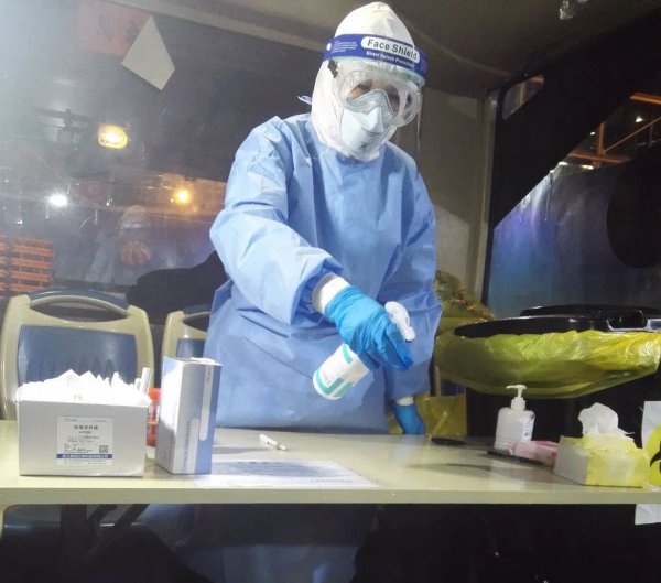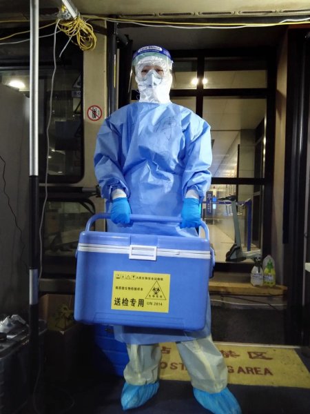 到達(dá)浦東機(jī)場后,她們的主要任務(wù)是采集咽拭子做核酸檢測,姑娘們第一時間進(jìn)入工作區(qū)域,經(jīng)過前輪隊(duì)員傳遞崗位信息、傳授實(shí)戰(zhàn)經(jīng)驗(yàn),大家快速熟悉工作環(huán)境和流程,力爭把控操作和采樣流程的每個環(huán)節(jié)都熟記于心,開始了“24小時待命”。上崗第一天就有臨時通宵航班任務(wù),姑娘們主動請纓工作通宵,這對剛剛適應(yīng)穿著防護(hù)服、戴著N95口罩防護(hù)眼鏡工作的人是極大的體力和意志的考驗(yàn),但是她們沒有一句怨言,堅(jiān)決服從安排,互相打氣,誓要以最高質(zhì)量完成支援任務(wù)。同時防護(hù)服和防護(hù)用具的穿脫是工作中最重要的環(huán)節(jié),大家在穿戴后互相幫忙,互相檢查,互相指導(dǎo),不容許絲毫馬虎和疏漏,堅(jiān)決做到一旦進(jìn)采樣點(diǎn)就要保證規(guī)范、避免交叉感染,百分之百確保防護(hù)安全。