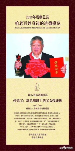 近日,投遞員孫德寶于德州市臨邑縣宣傳部組織開展的評選活動中,經(jīng)由社會評選,被評為2019年度臨邑縣“咱老百姓身邊的道德模范”。