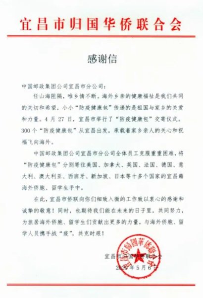 “宜昌市僑聯(lián)向你們細(xì)致入微的工作致以衷心的感謝和誠摯的敬意!”5月6日,宜昌市郵政分公司收到了一封來自宜昌市歸國華僑聯(lián)合會(huì)的感謝信。信中對(duì)宜昌分公司全體員工克服重重困難,將防疫物資寄給美國、加拿大等十多個(gè)國家的宜昌籍海外僑胞、留學(xué)生表示感謝。