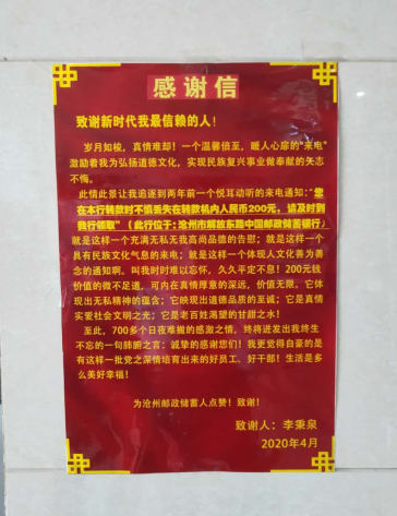 日前,滄州市分公司營業(yè)局收到一封“遲來”的感謝信。