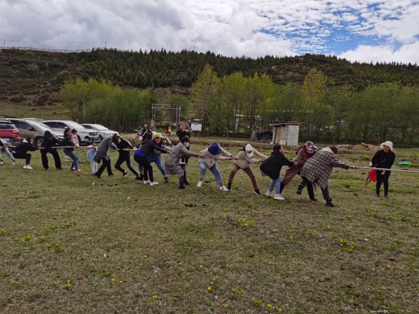 小憩時(shí),有爬山看花的,有去看牦牛的,有的在釣魚,到處是一片祥和的景象。接下來是集中活動(dòng),同時(shí)也是大伙展示才藝的時(shí)候。首先進(jìn)行了跳繩比賽,其次是拔河比賽,拔河比賽按年齡、按喜好等分成兩組進(jìn)行,輸?shù)慕M出一個(gè)節(jié)目,雖然輸了但仍獲得笑聲一片。最后是傳花接鼓,大伙圍成一圈順序傳遞花球,一人背著大家進(jìn)行擊鼓,在鼓聲停止時(shí)花球落到誰,就由誰來表演節(jié)目。有的唱流行歌曲、有的唱藏歌、有的唱兒歌、有的表演自己的小才藝,歡聲笑語飄蕩在藍(lán)天白云間,活躍的氣氛,不時(shí)引來旅客的圍觀。欣賞自然,放飛心情,工會組織讓廣大員工度過了舒心、愉快、安全的一天。