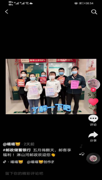 本次活動通過抖音、微信朋友圈的宣傳方式參加評比,全縣10個單位共上報了19部宣傳作品參賽,其中集體制作9部,個人制作10部。通過對宣傳作品視覺效果和宣傳效果評比,杜皮支局孫靜抖音《“五一”金融產(chǎn)品簡介》、總路咀支局裴翠云抖音《郵政金融業(yè)務(wù)宣傳》、金融業(yè)務(wù)中心抖音《“五一”產(chǎn)品推廣》三部作品榮獲優(yōu)秀宣傳作品將獎,賈廟支局邵明君、金融業(yè)務(wù)中心、馬曹廟支局劉宸辰、團黃路網(wǎng)點楊溢、方高坪支局王曉燕五部作品榮獲人氣宣傳作品獎。