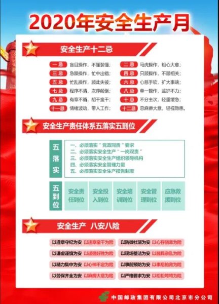 為認(rèn)真貫徹落實(shí)習(xí)近平總書記“從根本上消除事故隱患,有效遏制重特大事故發(fā)生”的重要指示精神,推動(dòng)安全生產(chǎn)專項(xiàng)整治三年行動(dòng)安全風(fēng)險(xiǎn)隱患排查整治工作順利開展,根據(jù)《國(guó)務(wù)院安委會(huì)辦公室和應(yīng)急管理部安委辦關(guān)于開展2020年全國(guó)“安全生產(chǎn)月”和“安全生產(chǎn)萬里行”活動(dòng)的通知》部署和《中國(guó)郵政集團(tuán)有限公司關(guān)于開展2020年“安全生產(chǎn)月”活動(dòng)的通知》要求,北京郵政于6月開展“安全生產(chǎn)月”活動(dòng)。 活動(dòng)時(shí)間為6月1日至30日;活動(dòng)主題為“消除事故隱患、筑牢安全防線”。
