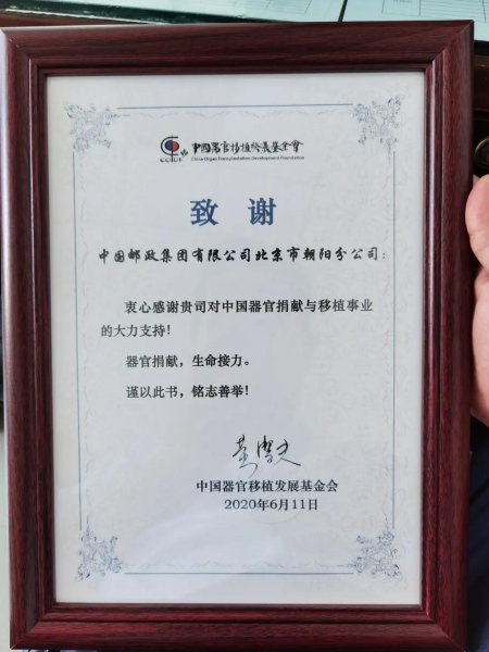 在本次活動中,朝陽區(qū)分公司總經(jīng)理袁喜與中國器官移植發(fā)展基金會理事長黃潔夫、著名藝術(shù)家韓美林共同為“器官捐獻 生命接力”郵冊揭幕。為感謝朝陽郵政的大力支持,該基金會秘書長趙洪濤還為朝陽區(qū)分公司總經(jīng)理袁喜頒發(fā)致謝證書。