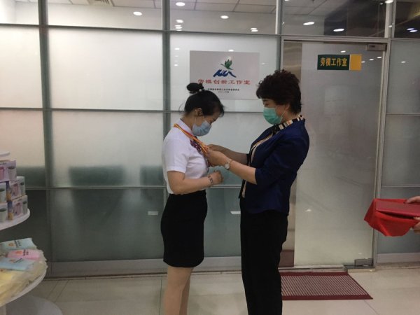圖為吉林市總工會副主席劉紅衛(wèi)親自為梁春慧佩戴上勞動獎(jiǎng)?wù)?/p>