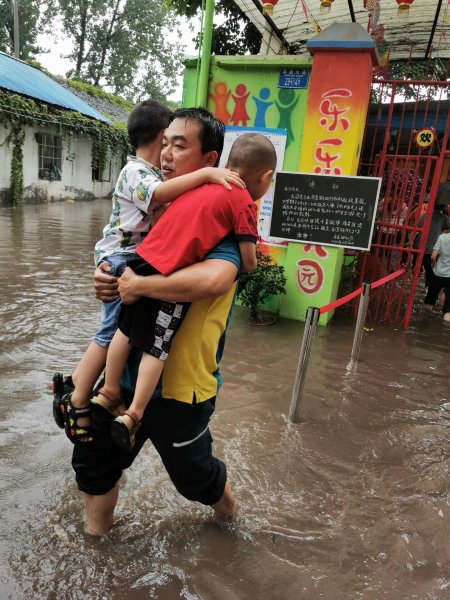 見此情況,王維立即安排2名員工留守網(wǎng)點繼續(xù)營業(yè),其余5人前往幼兒園幫助老師們一起將困在園中的孩子們轉(zhuǎn)移到郵政網(wǎng)點大廳。郵亭郵政所的員工們脫掉鞋子、挽起褲腳,便沖進(jìn)了雨中,他們有的將孩子背在背上,有的將兩個孩子抱在懷里,流水線作業(yè),默契配合,一部分人將孩子們從教室轉(zhuǎn)移到操場的舞臺,一部分人將孩子們從舞臺轉(zhuǎn)移到網(wǎng)點大廳。歷時半小時,60余名小朋友成功被轉(zhuǎn)移至安全地點。