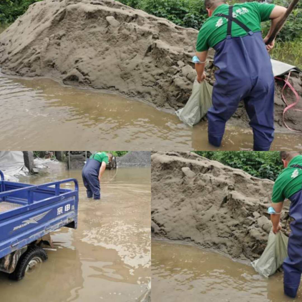 岑河支局在購買不到沙袋的情況下,自己動手、豐衣足食。支局經(jīng)理龔偉聯(lián)系到一家沙廠,岑河支局防汛突擊隊連忙來到沙廠,帶上鐵揪,將采購的一批蛇皮袋全部裝滿沙子,這批沙袋順利運回支局備用。