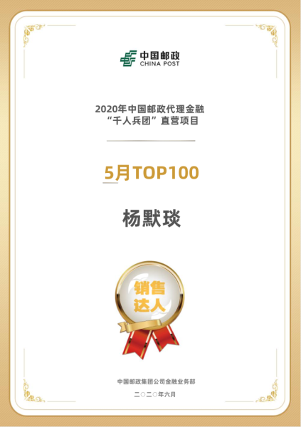 6月23日,由中國郵政集團(tuán)有限公司舉辦的2020年中國郵政代理金融 “千人兵團(tuán)”大作戰(zhàn)營銷活動5月TOP100銷售達(dá)人名單揭曉,廣水分公司航空路支局理財經(jīng)理楊默琰以全國第12名的成績登上榜單!