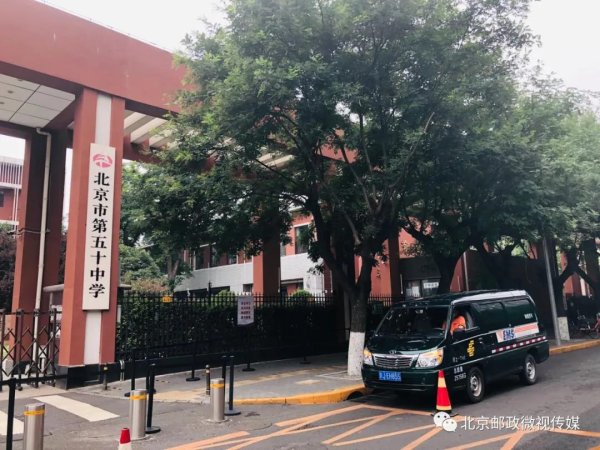 恰逢高考,不能進入校園。老師和投遞員在學(xué)校門口進行了仔細的清點交接。