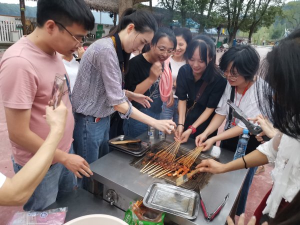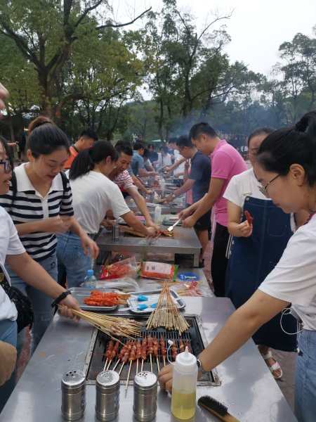 在鳳凰灣森林樂園,大家被美景吸引,三倆成群,四處游玩,放松心情,靜待一場愉快的燒烤活動。不一會兒,活動現(xiàn)場香味彌漫,烤肉讓人垂涎欲滴。各種串串一旦烤熟,馬上就被圍在烤攤邊上的員工一搶而空。為了趕上大家吃的速度,“燒烤大師們”一個(gè)個(gè)都卯足了勁。