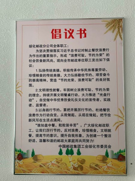 為深入貫徹習(xí)近平總書記重要指示精神,落實(shí)省郵政工會(huì)“我節(jié)約 我光榮 我行動(dòng)”傳真要求(黑郵工傳〔2020〕13號(hào)),堅(jiān)決制止餐飲浪費(fèi)的行為,近日,綏化市郵政工會(huì)開展了“你光盤,我獎(jiǎng)勵(lì),共節(jié)約”活動(dòng)。要求廣大干部職工反浪費(fèi),要節(jié)省,發(fā)揚(yáng)中華民族的勤儉節(jié)約的美好精神。