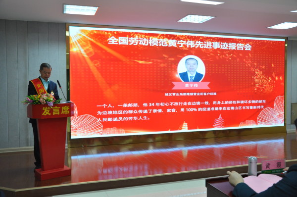為弘揚勞模精神、勞動精神、工匠精神,號召全體干部職工不忘初心、牢記使命,以榜樣的力量凝聚郵政企業(yè)發(fā)展的強大正能量。11月26日,崇左郵政公司在二樓多功能會議室召開全國勞動模范黃寧偉先進事跡報告會。市分公司領導班子、市分公司本部全體員工約計70人現(xiàn)場聆聽報告。市分公司副總經理、工會主席黃霞主持報告會。
