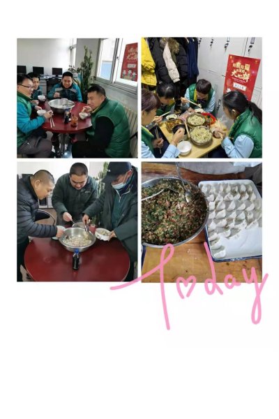 一大早,工作人員就來到食堂,和面的和面,切菜的切菜,調(diào)餡的調(diào)餡,大家用自己拿手的方式包著各式各樣的餃子。當(dāng)一盆盆熱氣騰騰的餃子端上來時,職工們一片歡呼:“吃餃子嘍!熱氣騰騰的小餃子來嘍!”大家一邊品嘗著美食,一邊分享著快樂,到處洋溢著“家”的味道、“家”的溫馨。