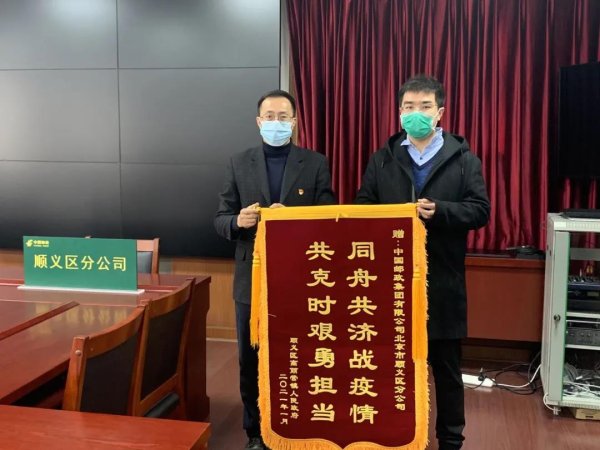 2月20日,順義區(qū)高麗營鎮(zhèn)人民政府疫情防控小組工作人員將一面印有“同舟共濟戰(zhàn)疫情 共克時艱勇?lián)?dāng)”字樣的錦旗送到了順義區(qū)郵政分公司,并對順義郵政在疫情防控期間所做出的努力表示衷心感謝。