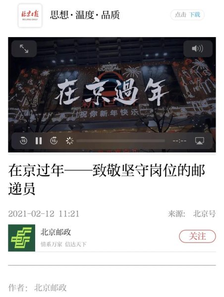 多渠道齊發(fā)力。春節(jié)期間,北京郵政推出特別策劃短片,聚焦“留京過年” 講述北京郵政投遞員留京過年,堅守崗位的動人故事——《每一份快遞年貨的背后都有他們的默默堅守》。短片生動詮釋了北京郵政人響應國家號召在京過年、堅守崗位的故事,贏得廣泛關注,取得了良好的宣傳效果。短片在新華社客戶端、北京日報客戶端、 中國郵政報微信平臺、騰訊網(wǎng)、鳳凰網(wǎng)、 好看視頻、芒果TV、網(wǎng)易視頻、京郵宣傳中心視頻號等多渠道、多平臺同步播出。截至22日,據(jù)不完全統(tǒng)計, 合計瀏覽量超過80萬次。