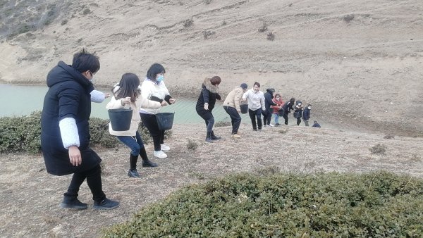 ▲山下接力取水澆樹