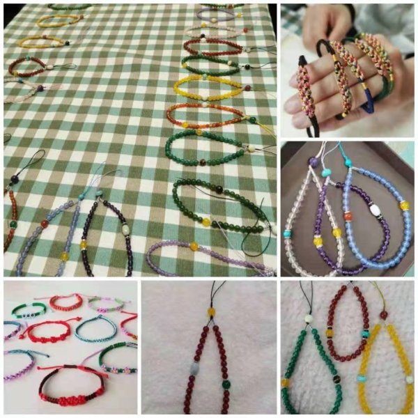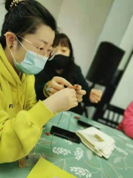 結(jié)繩看似簡(jiǎn)單,其實(shí)每一個(gè)步驟都很關(guān)鍵,錯(cuò)了一步就會(huì)失敗,幾個(gè)看似簡(jiǎn)單的動(dòng)作卻能編織出不同的繩結(jié),在老師不厭其煩的指導(dǎo)下,大家反復(fù)摸索,手法逐漸嫻熟起來(lái)!神奇的繩藝加上裝飾品的搭配,顯示出濃濃的中國(guó)風(fēng)以它獨(dú)特的魅力征服了大家!難得的手工DIY機(jī)會(huì)讓大家樂(lè)在其中?!翱次业闹殒溚旯だ病薄拔业钠卟适执埠昧恕甭曇舸似鸨朔?,女神們迫不及待迫不及待向在場(chǎng)的人展示自己的手工作品。