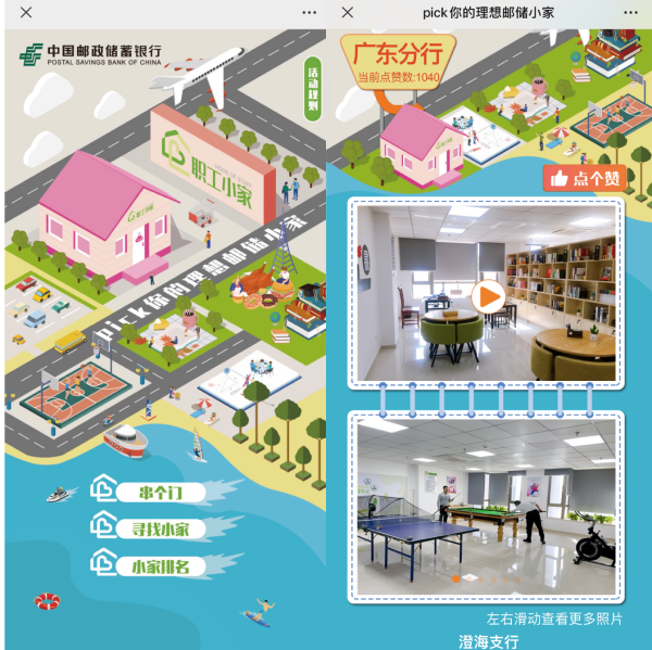 本次“職工小家”示范點(diǎn)線上展示評比活動在“郵儲銀行微工會”公眾號平臺上進(jìn)行,利用H5技術(shù)通過視頻、照片等方式全方位展示全行不同地域職工小家示范點(diǎn)的精神風(fēng)貌和文化特色,使職工線上感受我行各具特色的“職工小家”家文化,票選職工心中理想郵儲職工小家。