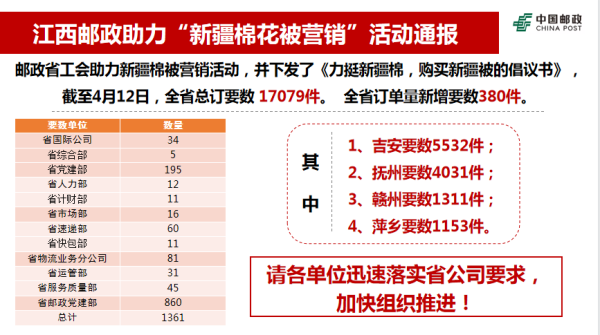 3月29日,江西省郵政工會面向全省郵政全體職工發(fā)出了《力挺新疆棉,購買新疆被的倡議書》:一是力挺新疆棉,購買新疆被,黨員干部帶頭以實際行動支持此項活動,踴躍購買;二是積極轉(zhuǎn)發(fā)集團公司應(yīng)援新疆棉的宣傳鏈接,廣泛傳播,擴大宣傳面。全省郵政廣大職工積極響應(yīng)、踴躍下單購買新疆被,以實際行動支持優(yōu)秀國貨出圈,為“新疆棉”加油鼓勁。截止4月12日,全省郵政職工共自發(fā)購買新疆棉被近17079件。