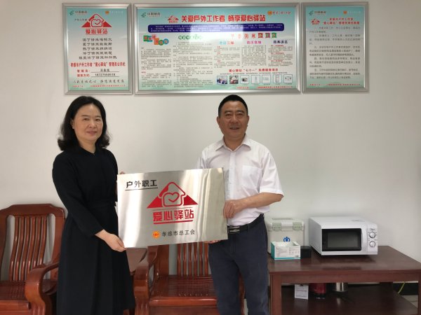 5月28日上午,孝感市總工會副調(diào)研員萬纓來到孝南區(qū)車站郵政支局為新建成的“愛心驛站”授牌。