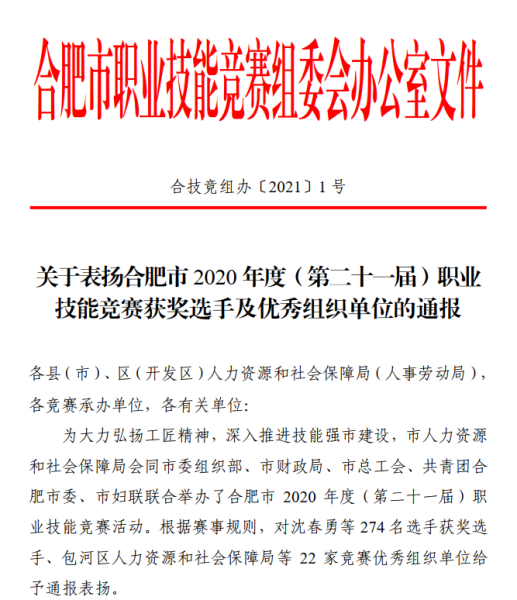 近日,從合肥市職業(yè)技能競賽組委會(huì)辦公室獲悉,合肥郵區(qū)中心局蟬聯(lián)合肥市 2020年度(第二十一屆)職業(yè)技能競賽優(yōu)秀組織單位??字俱懙?名同志榮獲“合肥市技術(shù)能手”榮譽(yù)稱號(hào)。該局連續(xù)十二年承辦合肥市業(yè)務(wù)技能競賽,連續(xù)十二年被評(píng)為優(yōu)秀組織單位,涌現(xiàn)一批集團(tuán)、省級(jí)業(yè)務(wù)技術(shù)能手及上百名市級(jí)術(shù)能手和金牌職工。
