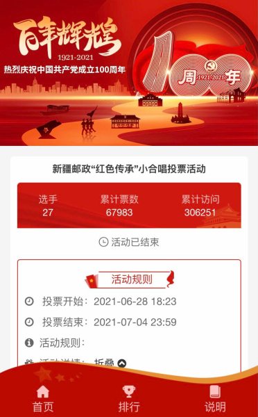 為慶祝中國共產黨成立100周年,推動全區(qū)郵政學黨史、悟思想、辦實事、開新局,新疆郵政工會在全區(qū)開展了“紅色傳承”小合唱微視頻展播活動,進一步在全區(qū)各基層單位營造學習黨史,歌頌黨情的良好氛圍。各單位積極響應,認真準備按要求報送了節(jié)目。節(jié)目充分展現了中國郵政人堅守初心使命、傳承紅色基因、高揚黨的旗幟、凝聚奮斗精神的時代風采,彰顯了郵政職工昂揚向上的精神風貌。區(qū)郵政工會從全區(qū)各單位報送的37個節(jié)目中初步評選出27個節(jié)目并采用評為評選(占50%)+網絡投票(占50%)的方式進行評選。經過為期一周的網絡投票和評為評審最終評選四個獎項,即:一等獎一個,二等獎二個,三等獎三個,優(yōu)秀節(jié)目獎八個。