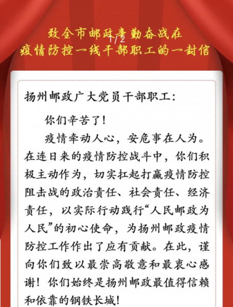 “今年以來,揚(yáng)州公司克服各種不利影響,改革創(chuàng)新取得了明顯成效。面對(duì)當(dāng)前揚(yáng)州嚴(yán)峻復(fù)雜的疫情防控形勢,你們一手抓防疫一手抓發(fā)展,取得了很好的效果,希望你們繼續(xù)按照地方政府要求,全力做好疫情防控各項(xiàng)工作。堅(jiān)持人民至上、生命至上,把困難估計(jì)得更充分,把形勢考慮得更嚴(yán)峻,齊心協(xié)力、攻堅(jiān)克難,在保證疫情防控要求的前提下,努力彰顯中國郵政的責(zé)任擔(dān)當(dāng),堅(jiān)決打贏疫情防控和經(jīng)營發(fā)展的‘雙勝利’!請(qǐng)向廣大揚(yáng)州郵政員工轉(zhuǎn)達(dá)省分公司黨委的誠摯問候!”8月3日上午,江蘇省分公司黨委書記、總經(jīng)理曹明發(fā)來的一條慰問信息,極大地鼓舞了奮戰(zhàn)在抗疫戰(zhàn)場上的揚(yáng)州郵政全體干部職工的信心和決心。